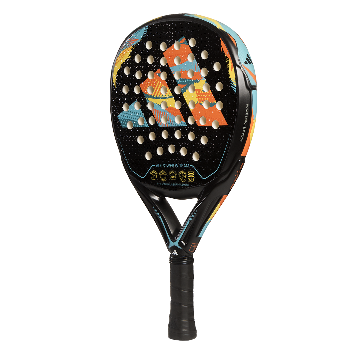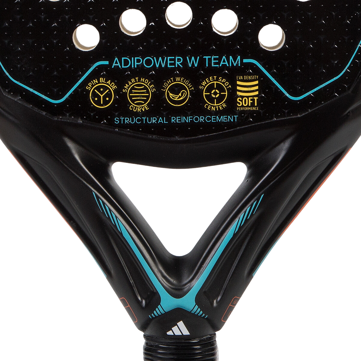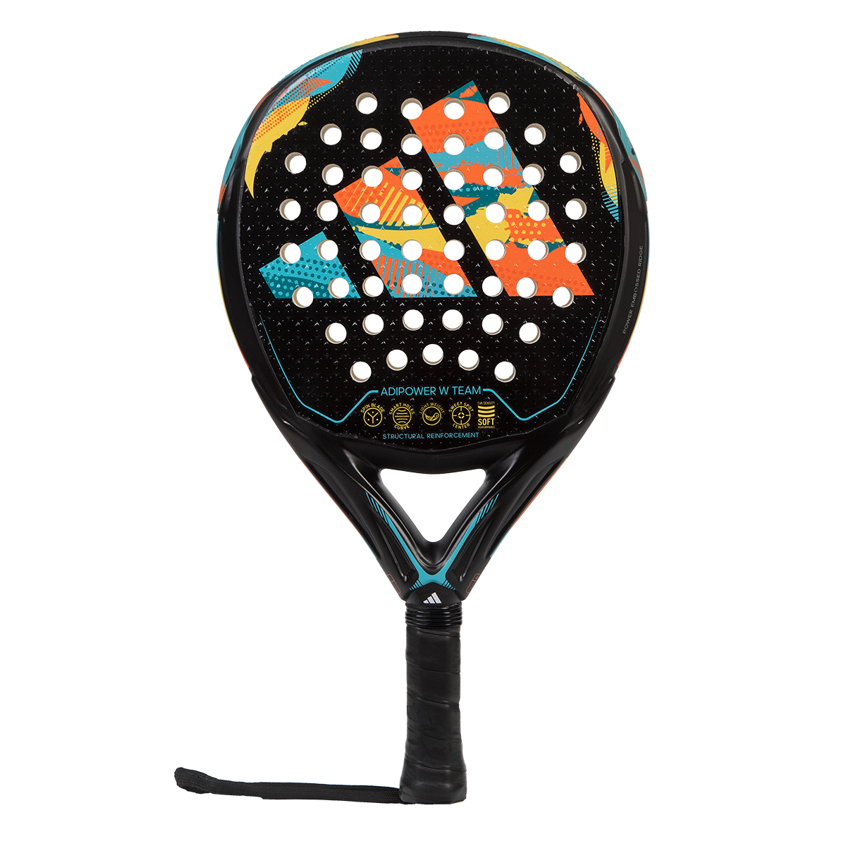 La ADIPOWER WOMAN TEAM reúne la superficie de FIBER GLASS con el interior de goma EVA SOFT PERFORMANCE. Con ellas, la pala nace con la capacidad de controlar al juego a la vez que asegura la mayor comodidad. Además, su salida de bola es muy interesante. La forma de la cabeza es redonda, con lo que gana en control y da un paso más en la garantía de confort. La tecnología DUAL EXOSKELETON en el marco de la pala, incrementa su rigidez y su predisposición a la potencia. Completa una pala tan sólida como manejable la tecnología SPIN BLADE, que abre la puerta a los mejores efectos.